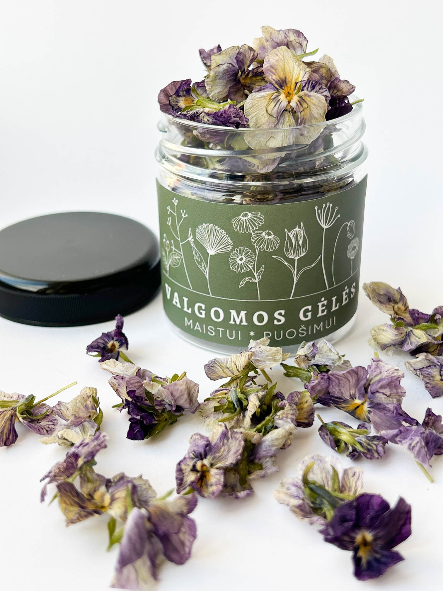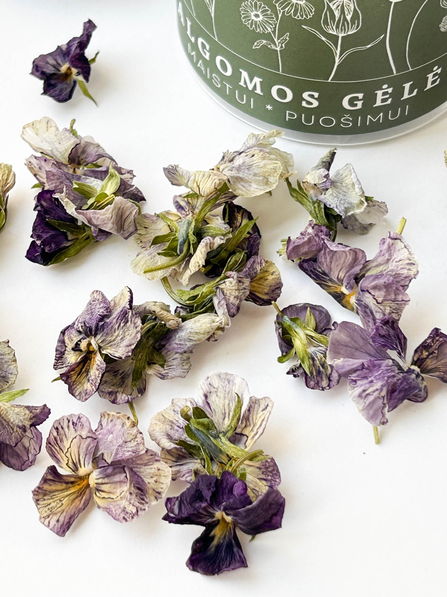 Liofilizuotus našlaičių žiedus galima naudoti visur: puošiant patiekalus, užkandžius, kepinius, desertus ar gėrimus.